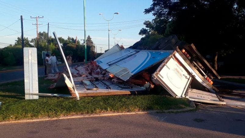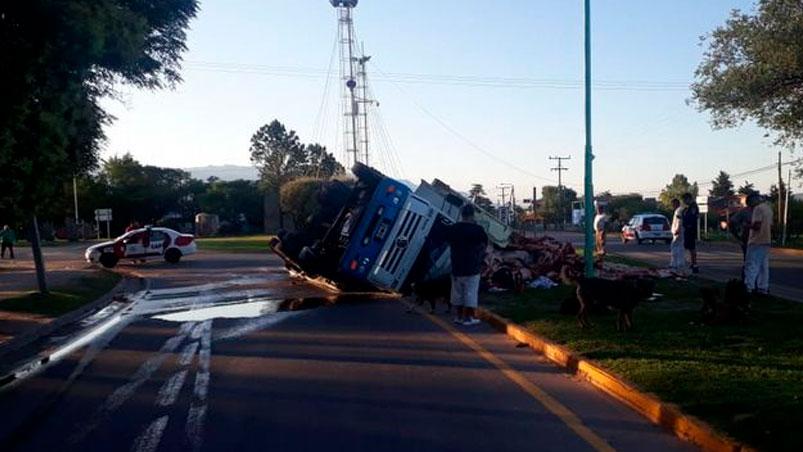 Un enorme camión de la empresa La Superior S.A. que transportaba más de 12.000 kilogramos de carne vacuna volcó en el ingreso a la ciudad de Mina Clavero.