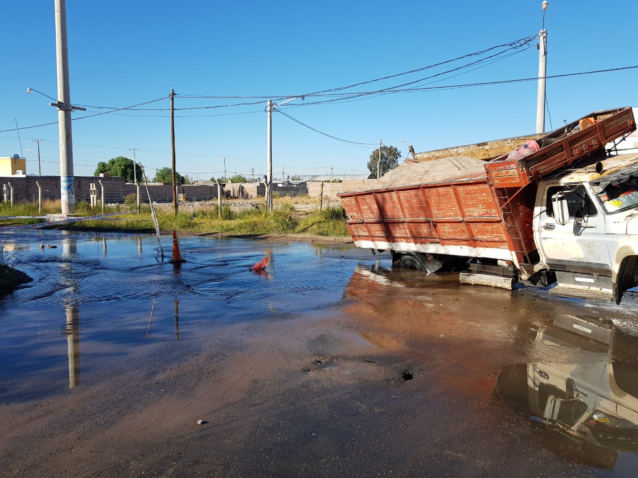 El rodado de gran porte quedó varado debido a que la zona estaba completamente inundada por un caño de agua roto.