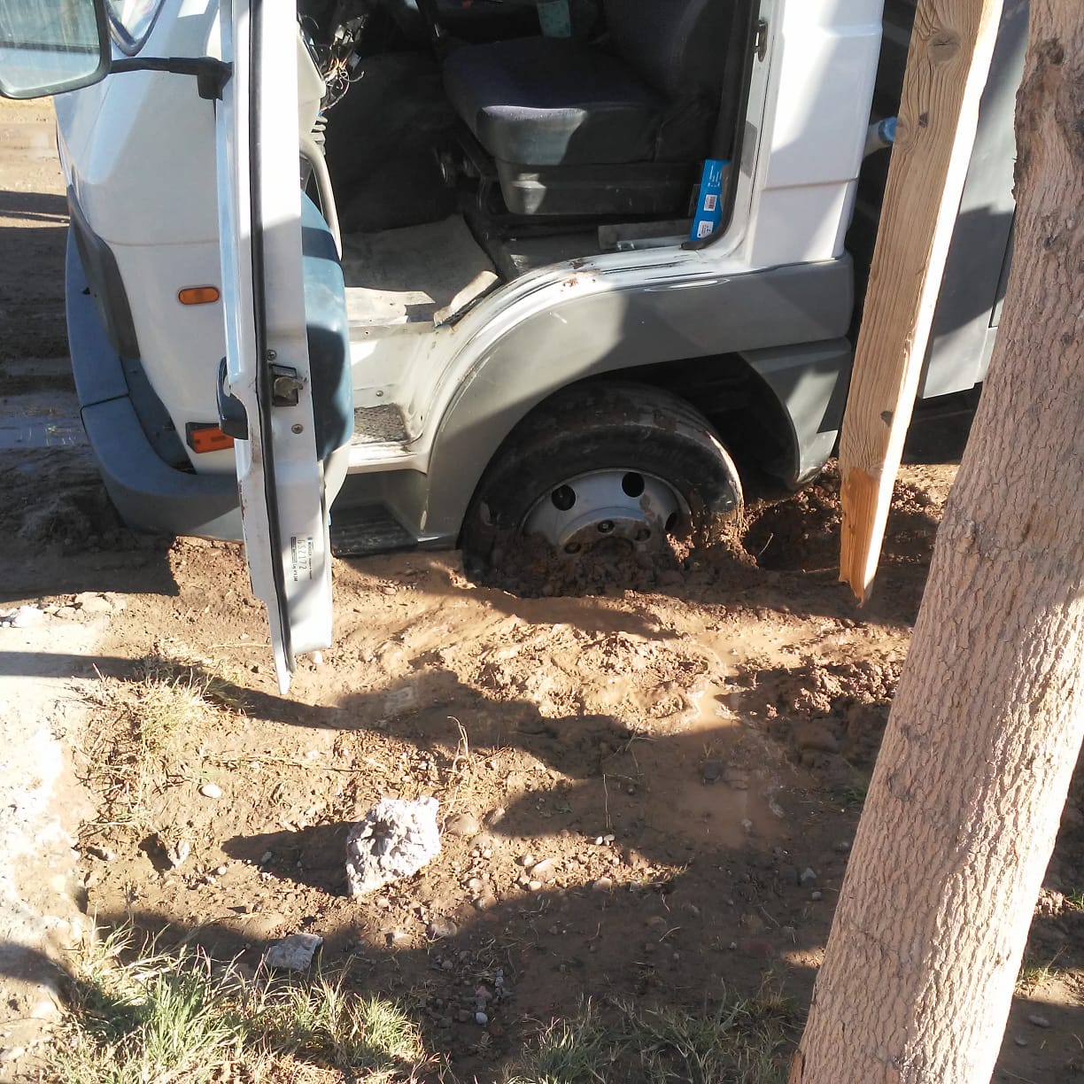 En esta oportunidad, un camión quedó atascado de un pozo del Barrio UDA 1, debido al agua que se acumuló en el lugar y removió la tierra.
