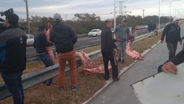 Un camión frigorífico que transportaba cerdos faenados sufrió la pérdida de gran parte de su carga al desfondarse el acoplado en el kilómetro 7 de la ruta nacional 168 -que une Santa Fe con Paraná- y varios vecinos del lugar aprovecharon la situación para llevarse la mercadería.