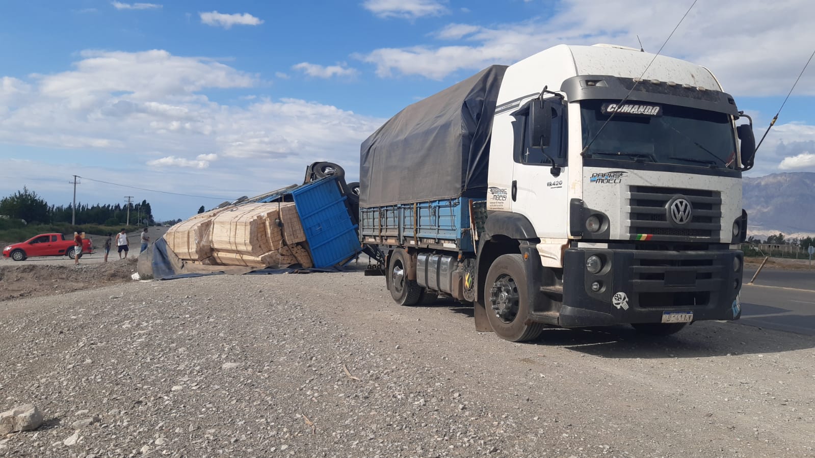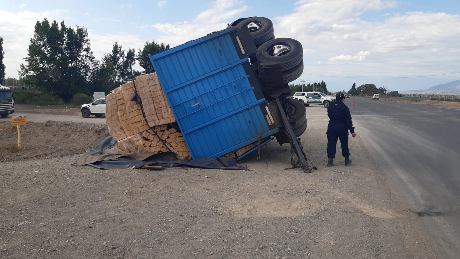 Fuentes policiales informaron que un camión VW que transportaba maderas aparentemente hizo una mala maniobra y ello provocó que el acoplado vuelque.