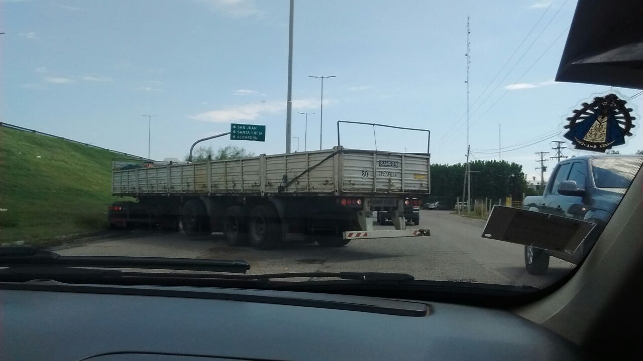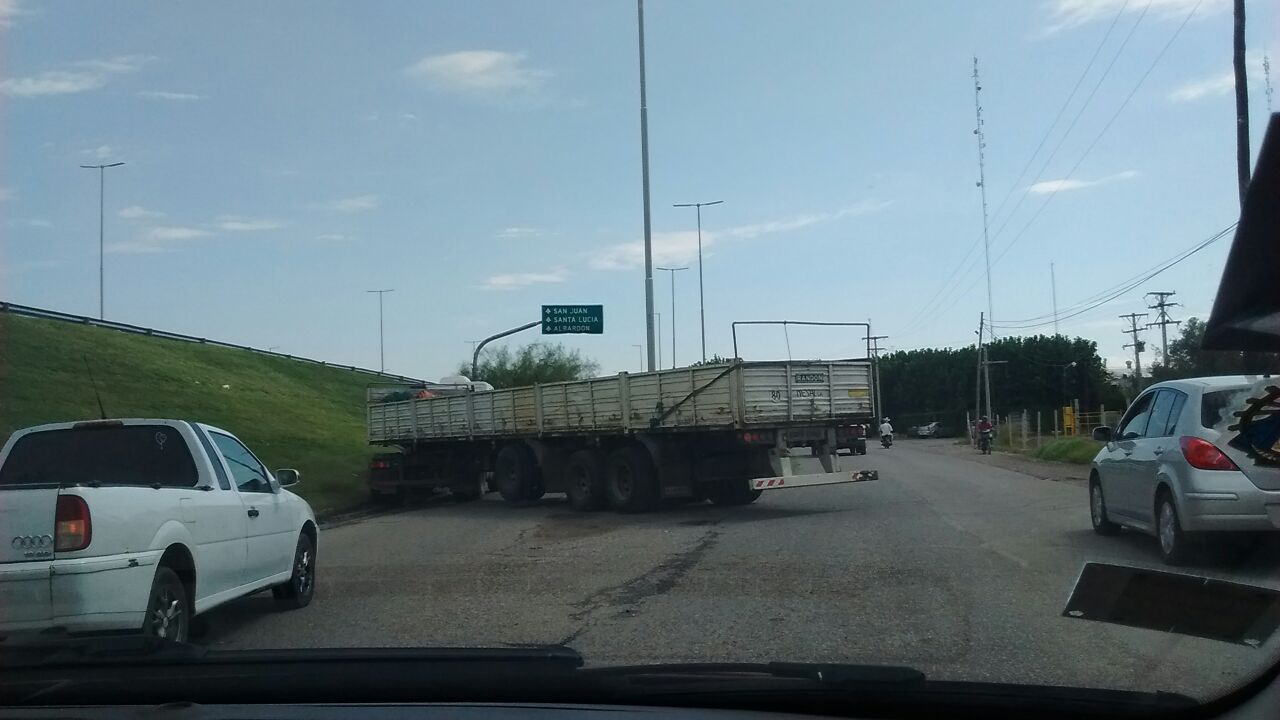 Según comentaron testigos del hecho, que se produjo pasadas las 11 de este miércoles, el conductor de un camión que llevaba un acoplado de grandes dimensiones intentó girar en U y terminó atascado en el pasto y cruzado sobre la calzada complicando el tránsito.