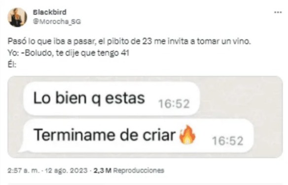 “Pasó lo que iba a pasar, el pibito de 23 me invita a tomar un vino. Yo: -Boludo, te dije que tengo 41”, manifestó en Twitter la usuaria @Morocha_SG, pero la respuesta sorprendió a todos en el espacio virtual que ahora se denomina "X". “Lo bien que estas, terminame de criar”.