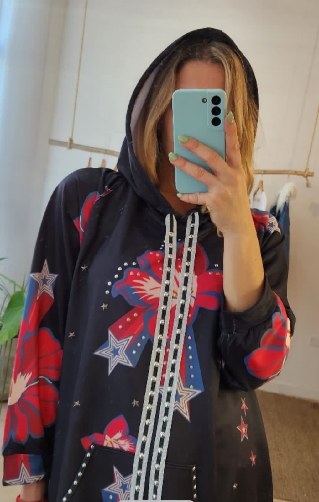 Buzo Haida: Confeccionado en algodón rústico liviano, manga ranglan, con capucha y aplicaciones de tachas. Estampa exclusiva de África design. Talle único. África, $35200