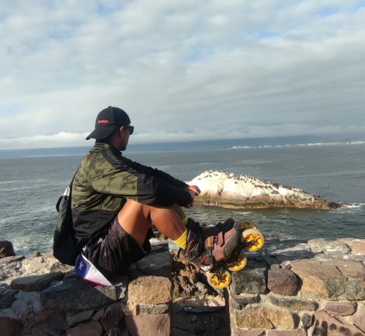 A bordo de dos patines con bota de fibra de carbono y 3 ruedas de 125mm, arribó a San Juan a fines de octubre y disfrutó a pleno de los Juegos que se desarrollaban, acompañado por otro osado patinador chileno Leandro Sánchez, oriundo de Valparaíso.