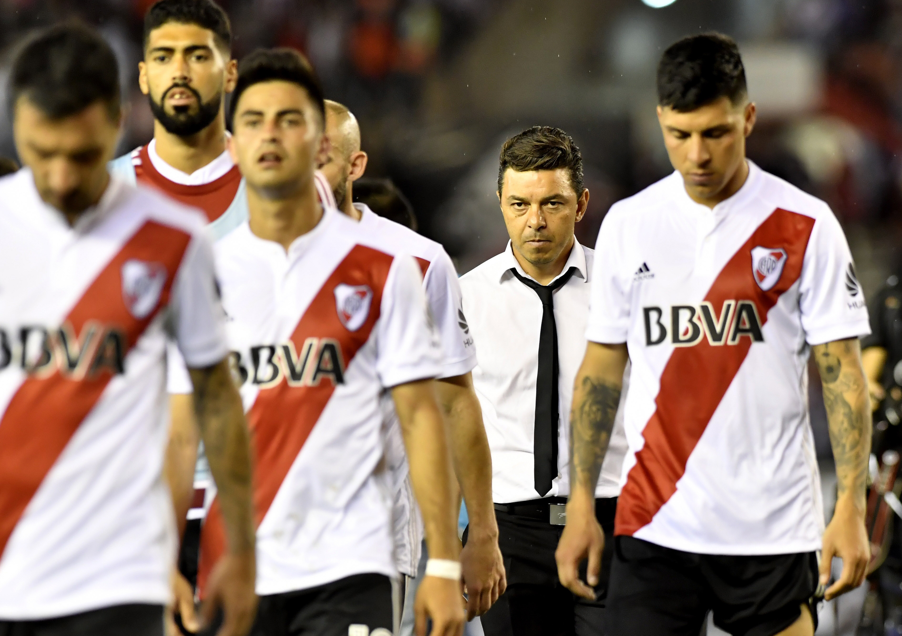 Masticando bronca. Marcelo Gallardo, junto a varios futbolistas, se retira con toda la furia a cuestas, tras una semana complicada para su River.