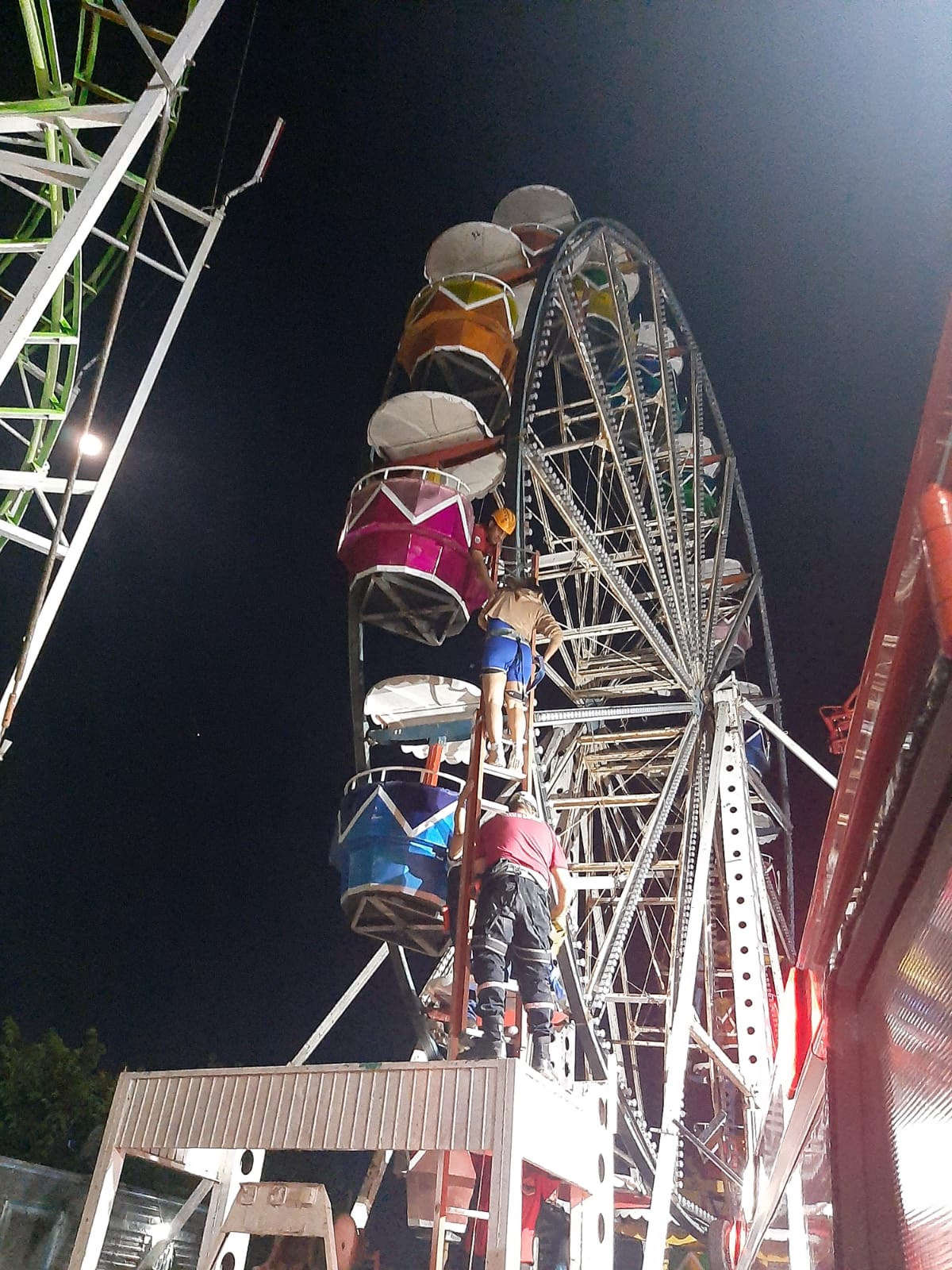 Es que el el juego conocido como la "Vuelta al mundo" tuvo un desperfecto y quienes estaban en las jaulas quedaron suspendidos en el aire por varios minutos a la espera de ser evacuados.