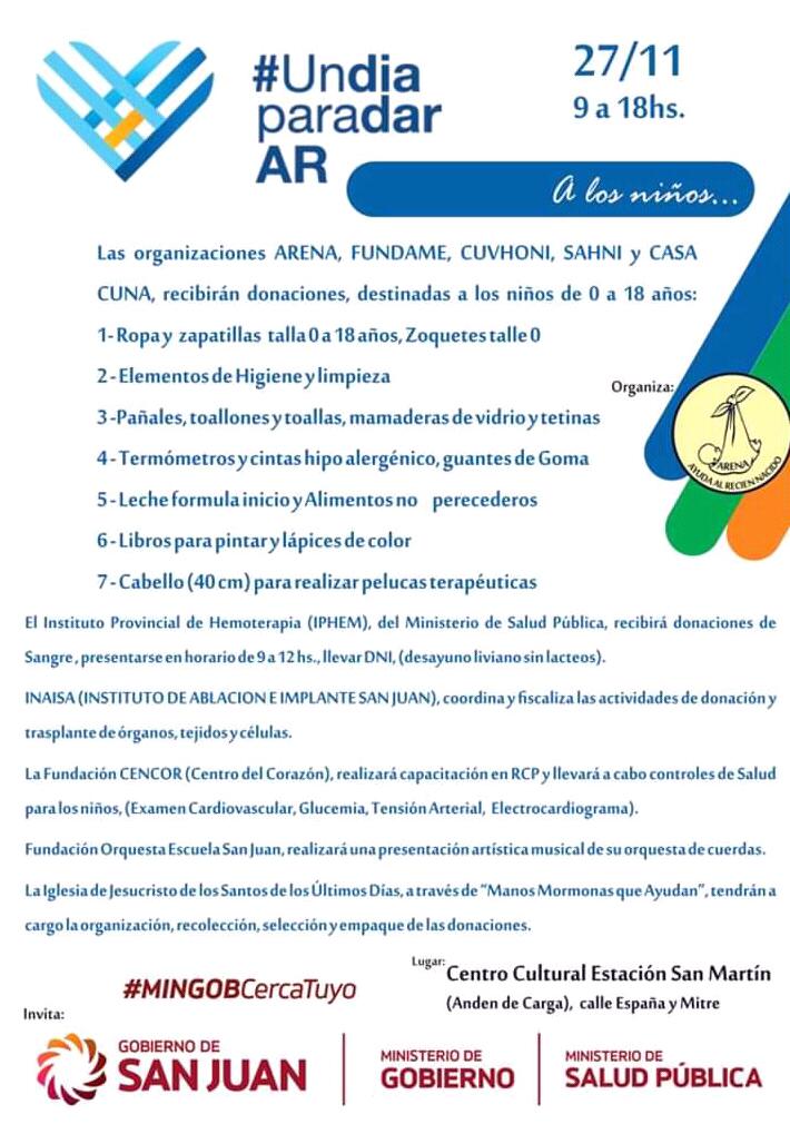 Este martes, de 9 a 18, San Juan será protagonista de una jornada solidaria, ya que diferentes organizaciones recibirán donaciones para niños de 0 a 18 años.
