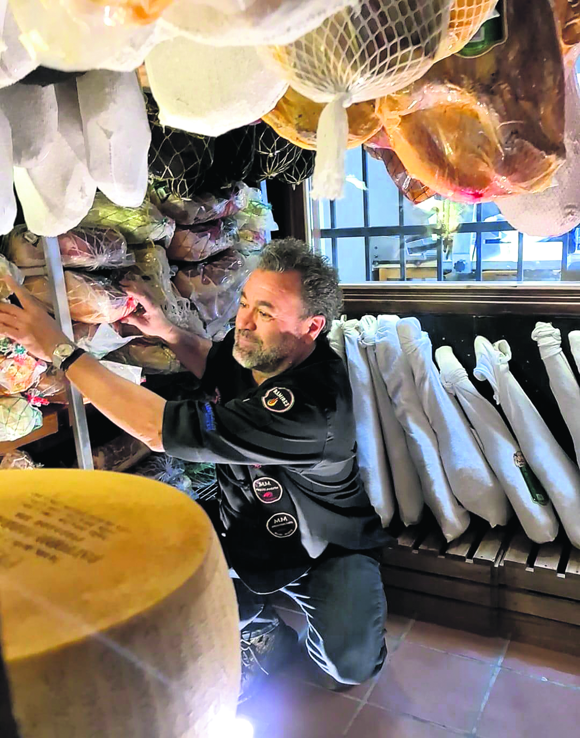 Cuando llegó el día en que la estación se vende, quedé con mi cartera de proveedores, de los cuales, Juan Emilio, es mi socio y amigo. Es a raíz de esta amistad donde surge el negocio de los jamones. Tratando de reinventarme y bien empapado en el tema, fui comprando jamones hasta que en un momento tenía 2.000 kg en la cámara. Trabajamos con una franquicia con los jamones para poder desarrollar esto con una charcutería de venta cruzada. Arrancar con el caballo del comisario en la Jamonería es poner en la mesa 6 jamones españoles y 6 jamones italianos, solo queda el postre, ¿no? Para mí era llegar a la meca de la gastronomía mediterránea. ¡Traer un Ibérico, un Parma! Comencé hacer negocio local con los jamones vendiendo a distintos comercios. Pero necesitaba potenciarlo, entonces es cuando comienzo a idear y crear este nuevo emprendimiento que me llevó de 4 a 5 años a puertas cerradas. Sí, porque me defino como muy personalizado, obsesivo, perfeccionista, por eso estudie cosa por cosa que hay en funcionamiento en la Jamonería. La experiencia de mercado y sorteando los momentos tanto económicos como de pandemia que eran y son difíciles, no me conforme y continué profundizando todo.