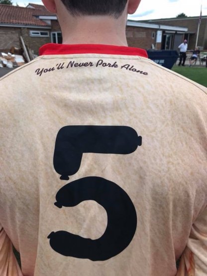 El toque especial que tienen las casacas viene en el dorso, donde además de un número que combina con la temática, aparece la frase "You’ll never pork alone", parodiando al famoso canto de los hinchas del Liverpool "You’ll never walk alone".