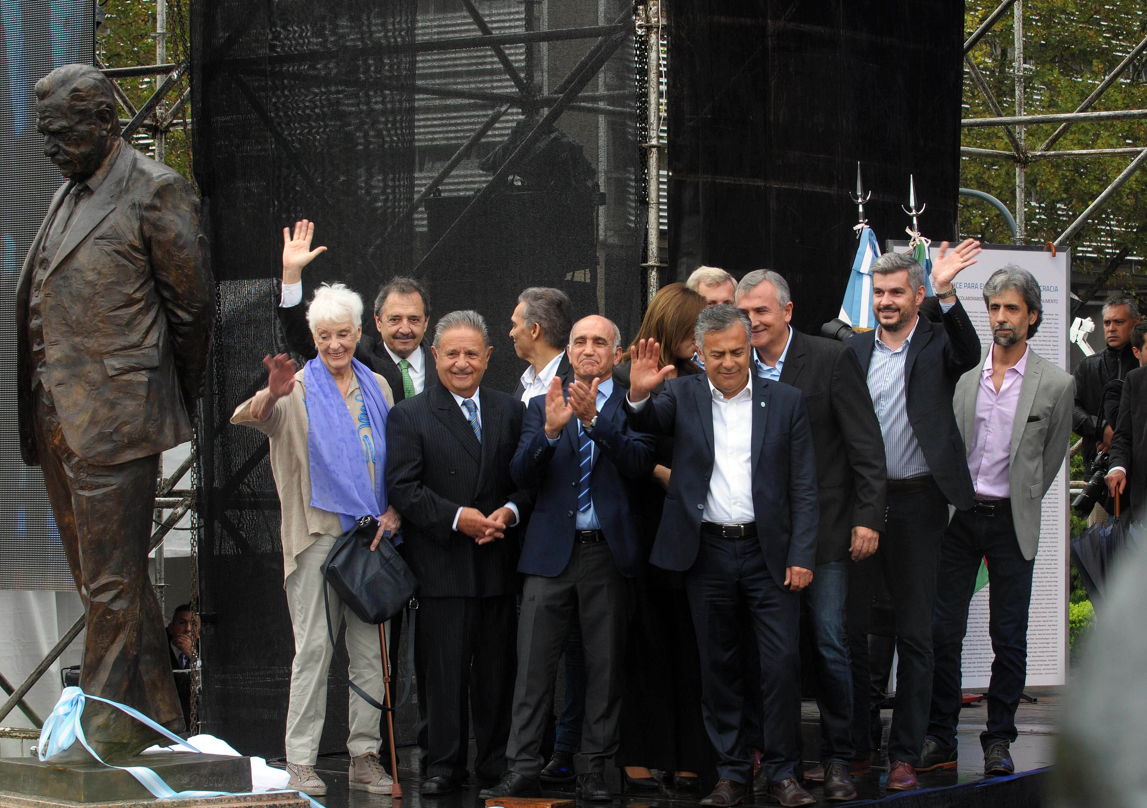 En la misma línea, Peña señaló que Alfonsín fue “un demócrata” que le dejó a los argentinos “una hoja de ruta metodológica sobre qué valores se tienen que poner adelante”, y una “hoja de ruta para unirnos y saber hacia dónde tenemos que ir”, anclada en “el valor de la paz y el valor de la Constitución Nacional”. La ceremonia de inauguración del monumento, modelado en arcilla y realizado por el escultor Carlos Benavídez, estuvo enmarcada por más de un centenar de personas que se acercaron al escenario, pese a la incesante lluvia.