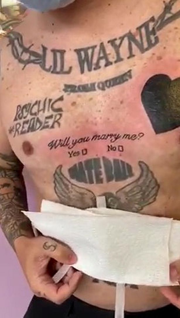 El hombre le había dicho a su novia que iba a tratar de cubrirse un tatuaje ya existente, mientras ella esperaba afuera del negocio durante unos 45 minutos. “¿Quieres casarte conmigo?“, era el mensaje que le estaban escribiendo a Bruno en el pecho. Cuando Patricia leyó las palabras esto, rápidamente tomó un bolígrafo y puso una cruz en la casilla “Sí”, que luego también estaba tatuada en el pecho de su prometido.