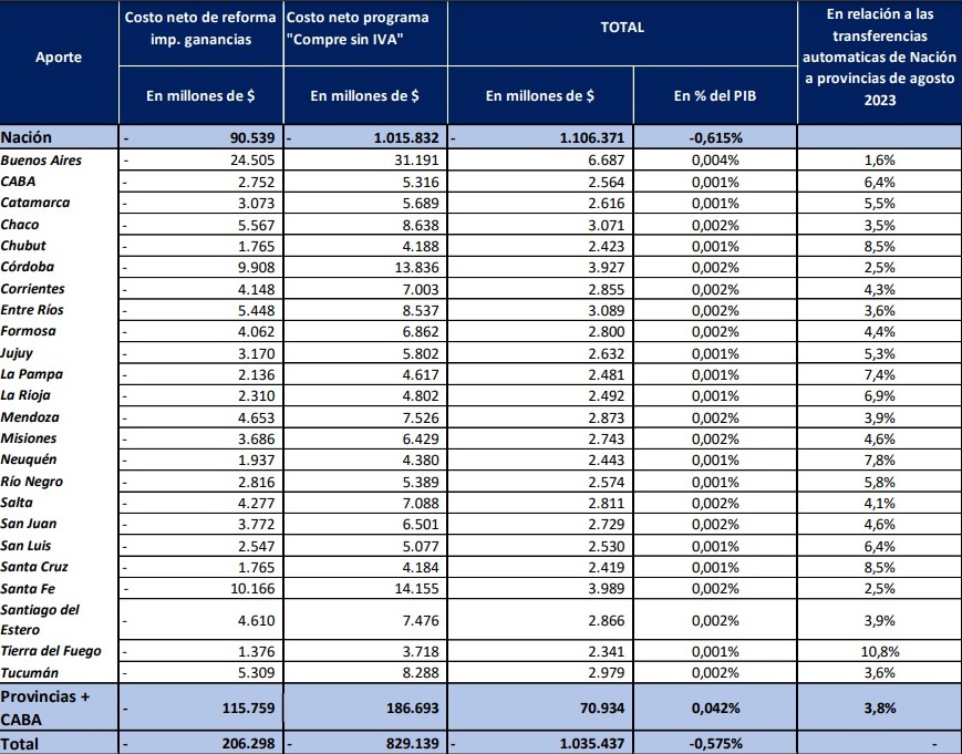 Es que, dado que por la reforma de ganancias las provincias y CABA perderían 0,06% del PIB de acá a fin de año, si el sistema de “Compre sin IVA” se aplicara plenamente, al término del día saldrían ganando 0,04% del PIB, dado que por el reintegro cobrarían un extra de 0,11% del PIB por mayor recaudación.
