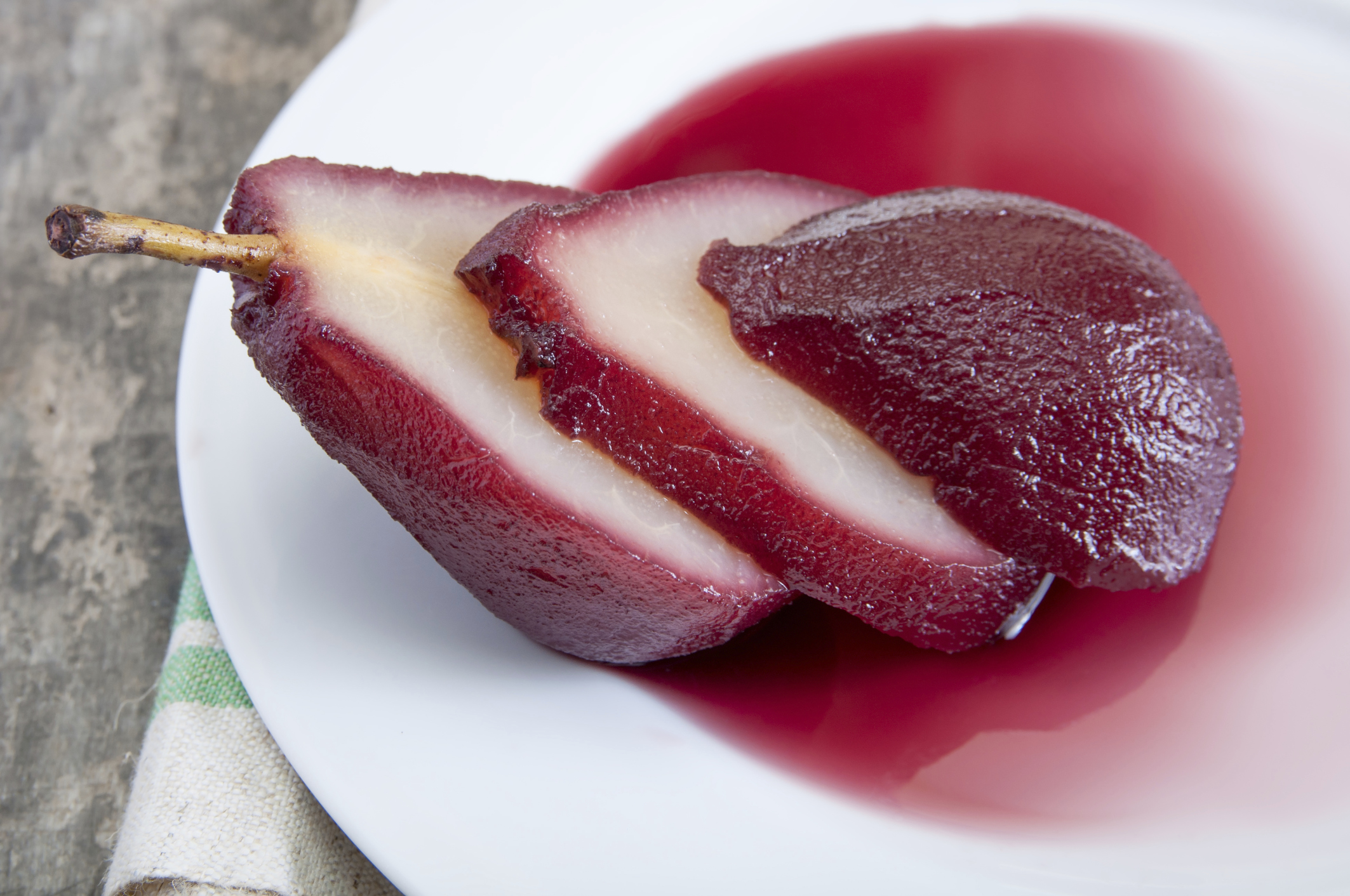 Ingredientes: 4 peras grandes, 500 centímetros cúbicos de vino Syrah, 150 gramos de azúcar, 1 rama de canela, 1 clavo de olor, cardamomo a gusto, nuez moscada a gusto.