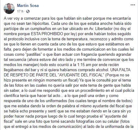 "Para los que hablan sin saber, me encantaría que no sean tan hipócritas. Cada uno de los que estaba anoche – por el lunes- había sido partícipe de un cumpleaños en un bar ubicado en Av. Libertador (no doy el nombre porque ESTA PROHIBIDO por ley) por ende habían todos seguido el protocolo inclusive con la toma de temperatura. Reconozco y admito que cada uno de los que estuvo estábamos en falta", comenzó diciendo.