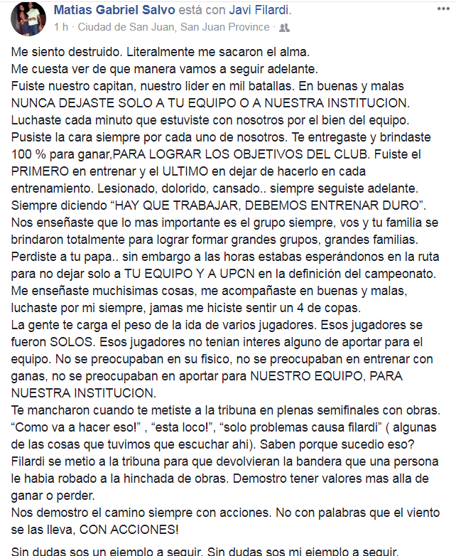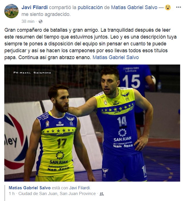 Quien en las últimas horas se expresó en las redes sociales dejando un emotivo mensaje para Filardi fue el sanjuanino Matías Salvo. Momentos después, llegó la respuesta del ahora excapitán.