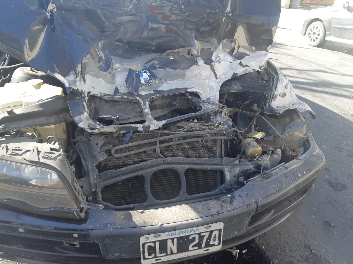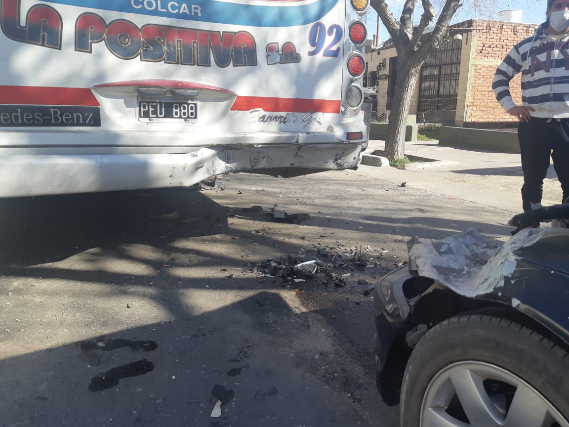 Un fuerte choque se produjo a media mañana de este sábado en Capital cuando un auto BMW impactó con la parte de atrás de un colectivo que esperaba que el semáforo cambiara para poder cruzar.