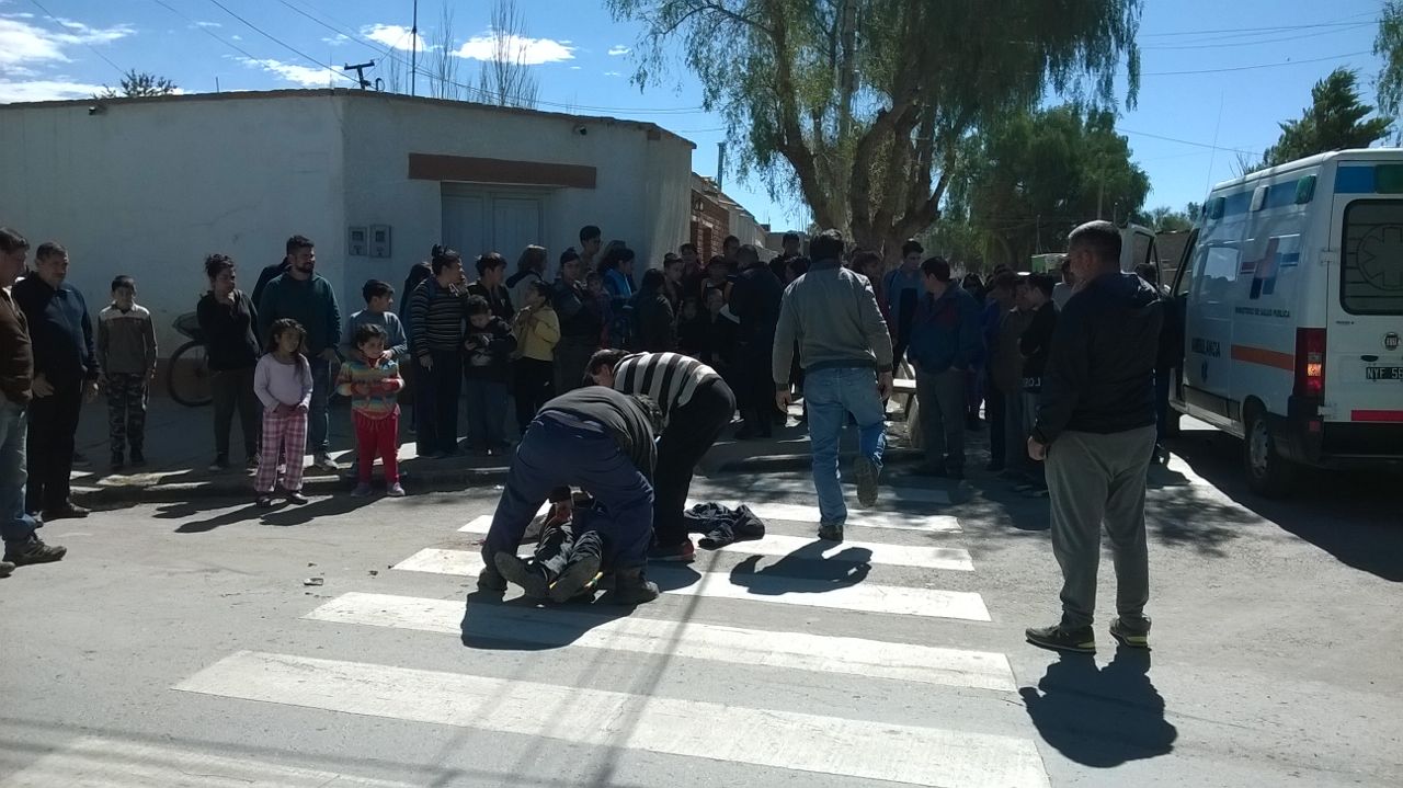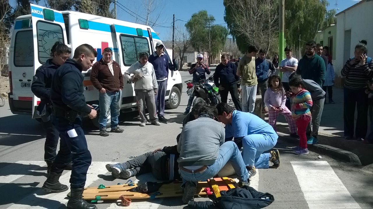 Cerca de las 12.30, en la esquina de General Acha y Rivadavia, en la villa cabecera de Jáchal, una moto y una bicicleta chocaron. En la Maverick Enduro 150 cc, circulaba Luciano Escudero y un menor de 7 años. Mientras que en la bicicleta iba una Lucrecia Bordón y dos niños.
