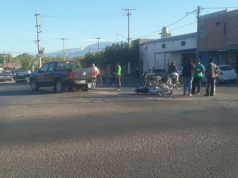 Este sábado en la tarde, un fuerte choque en Calle 5 antes del puente de Ruta 40, en el límite entre Rawson y Pocito, dejó a un motociclista debajo de una camioneta.