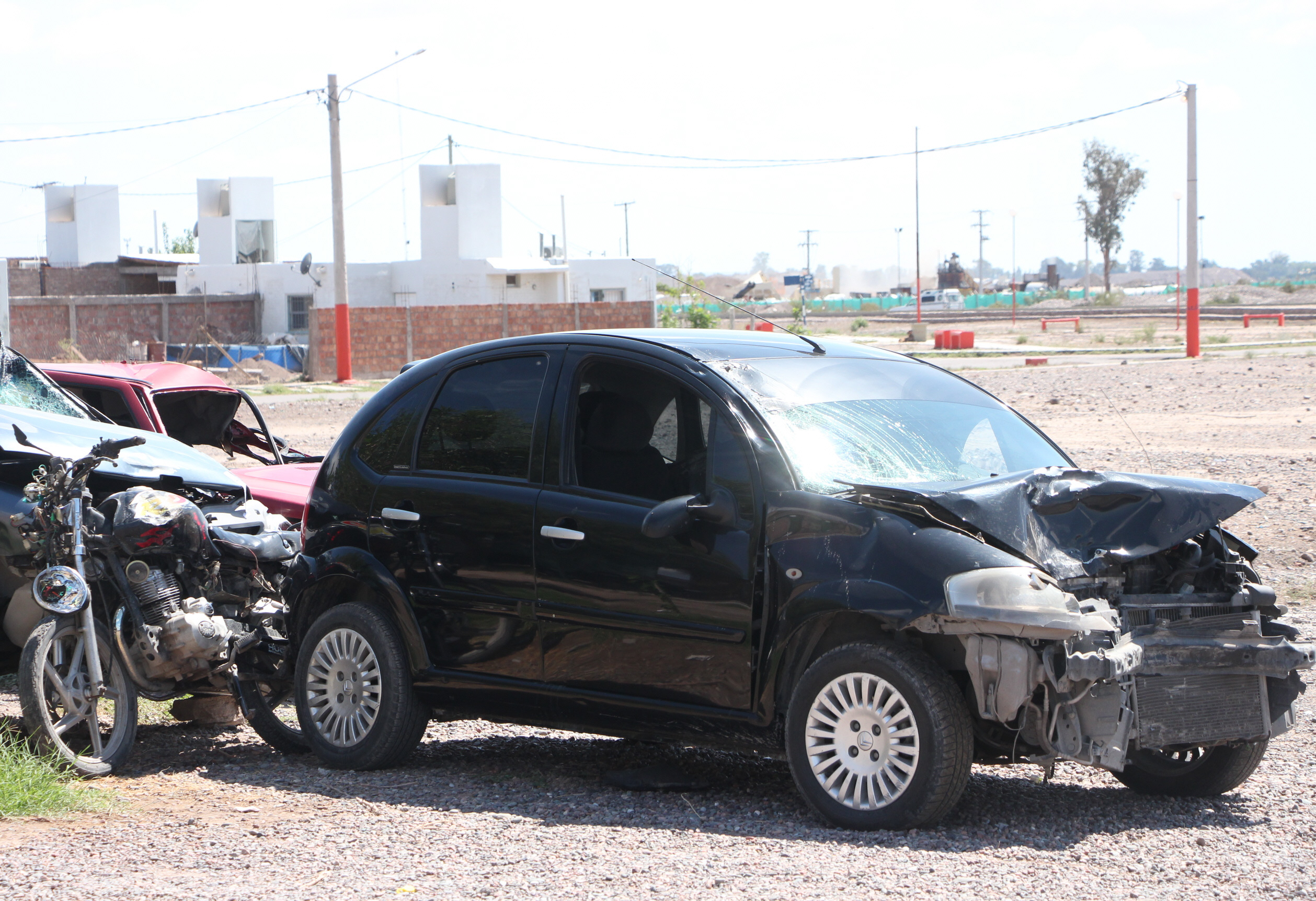 El impacto, muy fuerte. Tanto la moto Mondial 125 cc (izquierda) como el auto Citroën C3 (derecha) quedaron muy dañados.