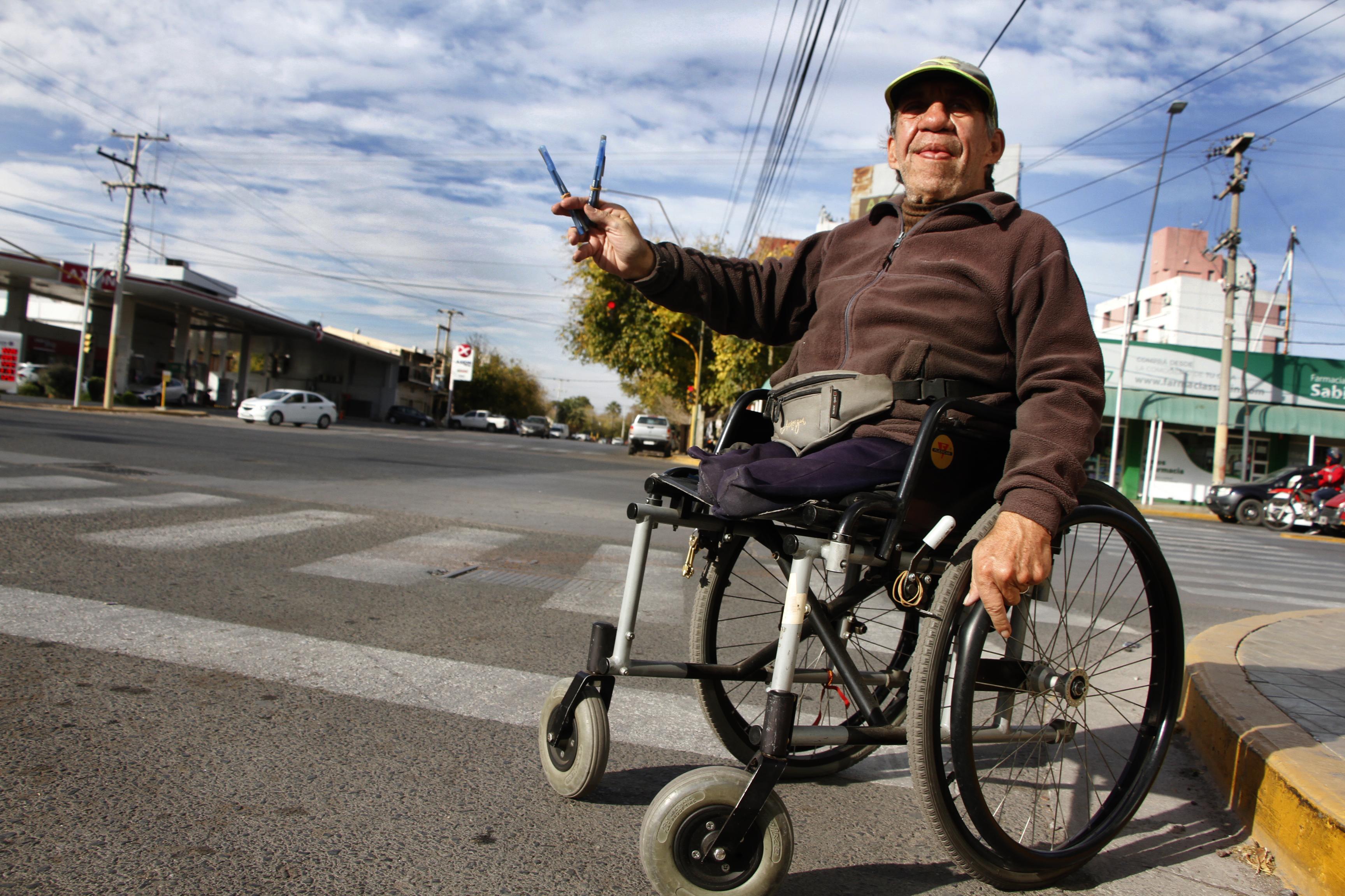 Todos los días voy y vengo entre autos ofreciendo las lapiceras cuando el semáforo está en rojo, lo hago de las 9 a las 12,30 hs, hasta que vendo todas. Nunca estuve de acuerdo con pedir limosna, de repente no quiero utilizar la silla de ruedas para algo más. Que me lo regalen es otra cosa. Mucha gente me da el dinero y no reciben la lapicera, lo acepto; ahora pasar el semáforo sin yo ofrecer nada, no. Yo tomo esto como mi trabajo, junto un monto de dinero para comprar lapiceras, pero de pronto suben la unidad, yo prefiero perder un poco de dinero porque debo ajustarme al tiempo que dura el semáforo, no hay tiempo para el vuelto, por eso lo redondeo para abajo hasta que puedo redondear en 100. Si bien soy jubilado, mi pensión no es gran cosa, yo alquilo donde vivo y además, le ayudo a mis hijas pagando los servicios, a pesar de ser grandes yo todavía estoy presente. El trabajo de mi señora y mío nos hace bien para los esparcimientos, salimos a cenar, a pasear y de vez en cuando a bailar. Patricia me enseñó y me hizo muy feliz; pero tenés la mirada ajena que es diferente, por ejemplo a ella la felicitan cuando baila conmigo, me dicen ‘sos un crack’, y yo me pregunto ¿por qué? Nos han sacado fotos y filmado mientras bailábamos, pero para mí es un avasallamiento hacia mi persona. Mi vida en San Juan es hermosa, muchos no entienden el tener asumido esta discapacidad, toda mi movilidad es la silla de ruedas, voy al médico, al centro o hacer trámites en ella. La ventaja es que cuando me muevo para el lado del centro todo es pendiente, ahora cuando regreso tomo el colectivo porque es subida y cuesta en la silla, siempre debo esperar el colectivo que tiene rampa. Cuando llegué a San Juan los colectivos con rampa no existían, empezaron aparecer en el 2019/20 y era uno o dos por línea y a veces no funcionan por diversos motivos. Sí agradezco a muchos choferes que me han alzado para subirme al colectivo, cosa que en Buenos Aires no pasa y esto me enamora de esta ciudad. También en los gestos de la gente que se ofrece a ayudarme cuando debo cruzar una calle.