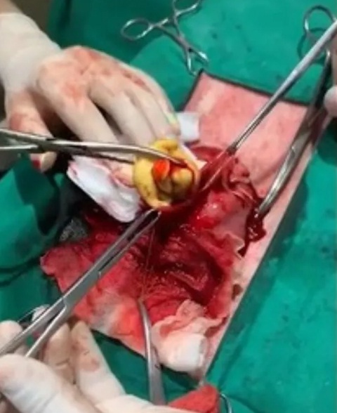 Ante esta situación, se le realizó una cirugía de emergencia que llevó más de una hora, y la cual finalizó cuando con pleno éxito sacaron a la mencionada cantidad de juguetes, junto con dos pedazos de bolas de goma y un bocadillo de piel de vaca sin digerir.