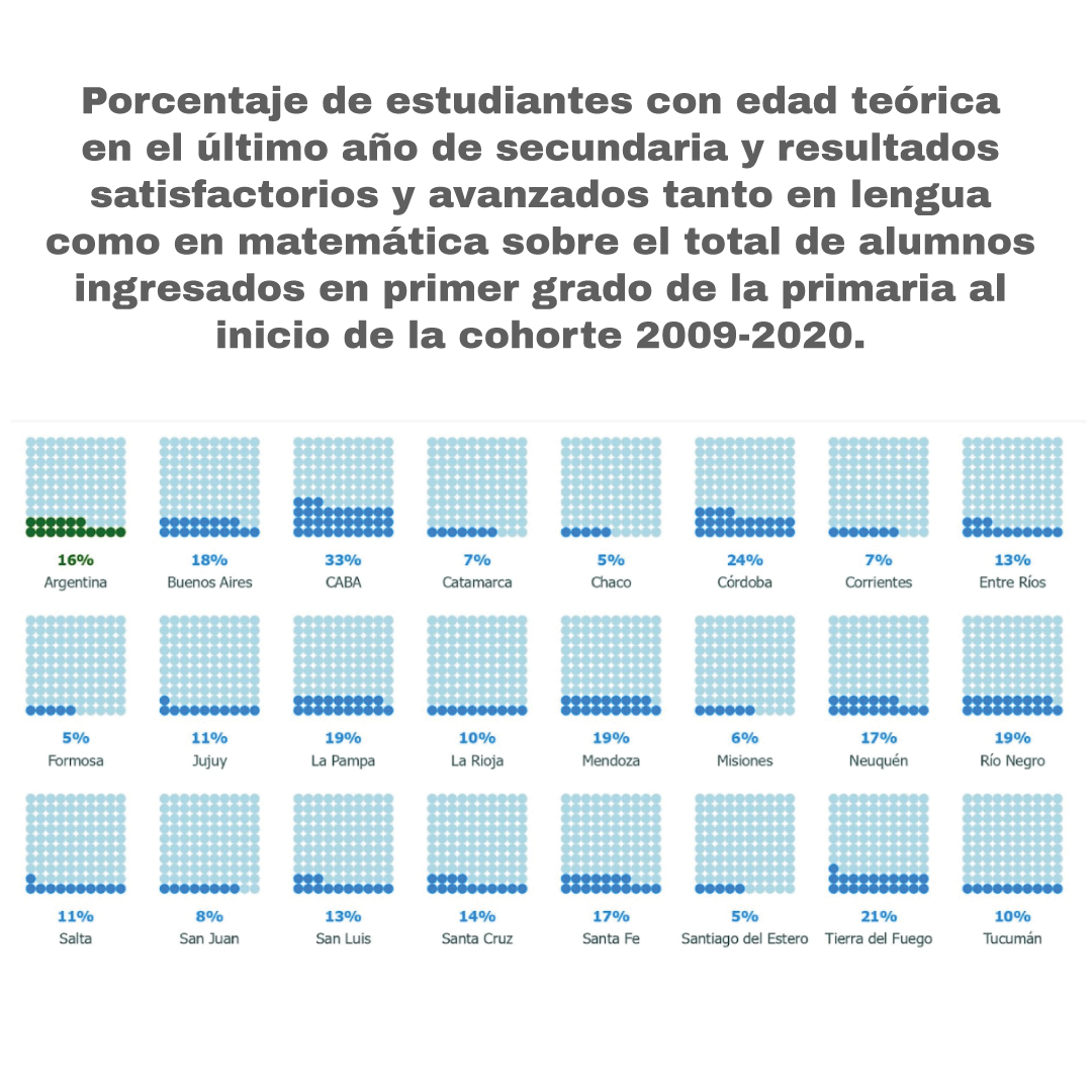 Otro dato alarmante es que a nivel país, solo el 53% de los alumnos finalizan escuela secundaria en el tiempo estipulado. El porcentaje es mayor en algunas provincias, como Tierra del Fuego (71%), Ciudad de Buenos Aires (66%) y La Rioja (61%). Mientras que en el otro extremo se ubican las provincias de San Juan (38%), Corrientes (38%) y Misiones (39%).