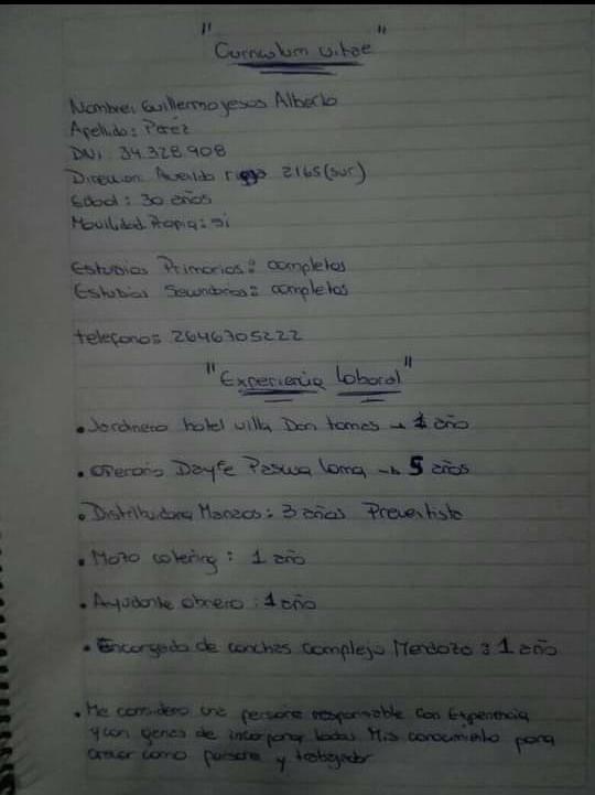Sin dinero para imprimir su currículum vitae pero con mucha energía para poder encontrar un trabajo que le permita mantener a su familia. Esa es la situación de Guillermo Pérez (30), el sanjuanino que se volvió viral luego de realizar su CV a puño y letra.