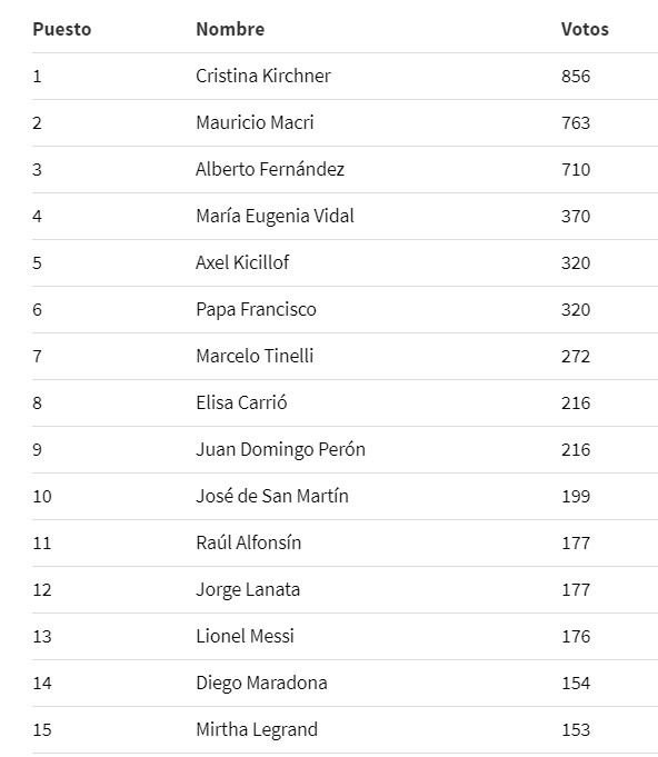 Debajo de Cristina, Macri y Alberto, y encima de Perón y San Martín, quedan María Eugenia Vidal, Axel Kicillof, el Papa Francisco, Marcelo Tinelli y Elisa Carrió.