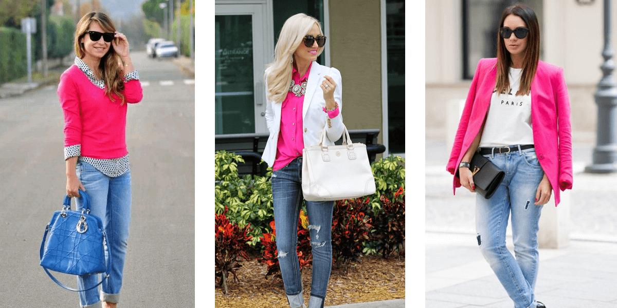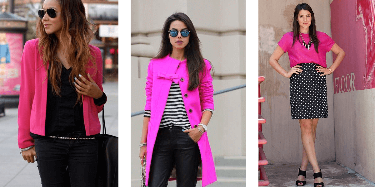 La clave para lucir un estilo formal y que nunca falla es combinar este emblemático color con colores neutros como el blanco o negro. Puedes optar por un lindo blazer en color fucsia, un par pantalones en color negro o neutros, junto con una blusa y un par de zapatillas que le darán el toque de elegancia a tu outfit.
