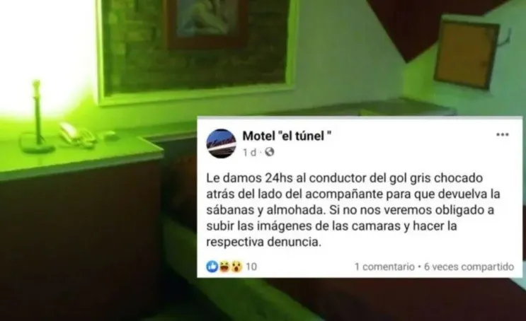 "Le damos 24 horas al conductor del Gol gris chocado atrás del lado del acompañante para que devuelva las sábanas y las almohadas", remarcaron desde la cuenta de Facebook del motel.