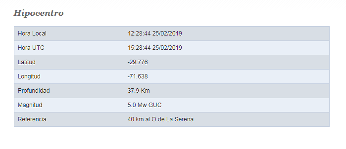 Según el Centro Sismológico Nacional, el temblo fue localizado a 40 kilómetros hacia el Oeste de La Serena, con una profundidad de 37,9 kilómetros.