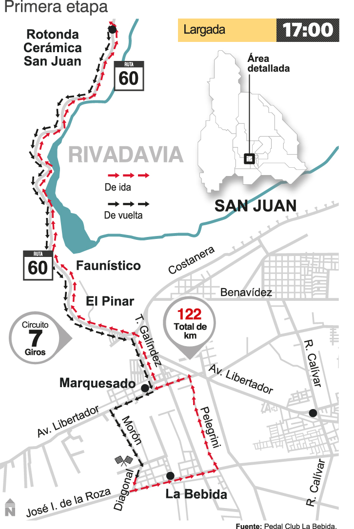 El espectáculo se completará mañana con dos esfuerzos, una contrarreloj matutina que tendrá siete kilómetros de extensión y se desarrollará íntegramente en el boulevard de Avenida Ignacio de la Roza, en la zona popularmente conocida como “el campo de La Bebida”. Y un tramo en línea vespertino que tendrá 118 kilómetros los que se cubrirán con diez giros al denominado “circuito chico”, compuesto por las dos grandes avenidas, Libertador y de la Roza, unidas en la base por calles Morón y Diagonal y en el vértice superior por el Jardín de los Poetas.