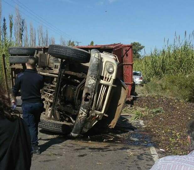 Kevin Macías (28) terminó cerca de las 12 de ayer llevándose un gran susto, cuando perdió el control del viejo camión Bedford que guiaba cargado con uvas y volcó en Calle La Plata, antes de Divisoria, Caucete. Sólo sufrió lesiones leves, informó la Policía.