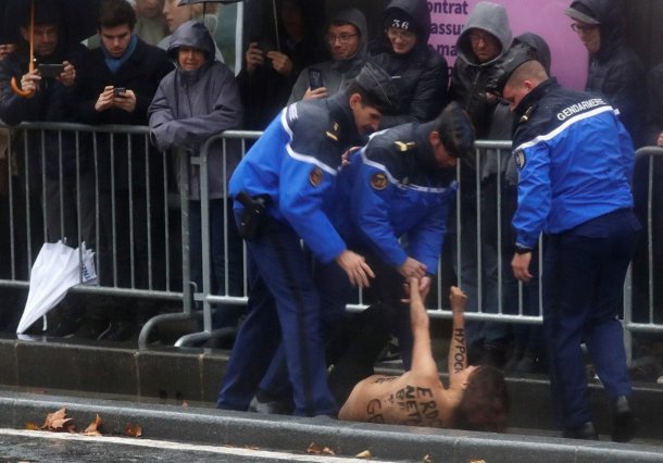 Topless #FEMEN protester almost throws herself at #Trump’s motorcade in #Paris https://t.co/7IVnlPbmxC pic.twitter.com/ViSxYGUawE