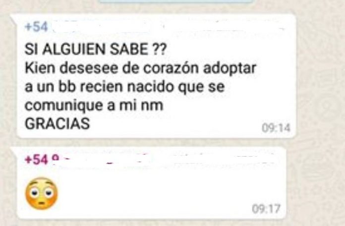 Una joven de 17 años de la localidad misionera de Panambí ofreció en adopción a su bebé por nacer en un grupo de venta en WhatsApp, lo que generó una polémica sobre la legalidad del trato pues según fuentes policiales no habría incurrido en delito, aunque se dio conocimiento al Juzgado de Familia para que siga de cerca el caso.