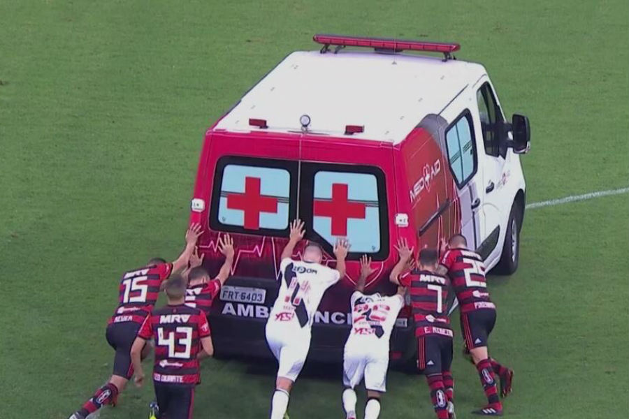Los jugadores de Flamengo y Vasco por un momento dejaron de lado la rivalidad durante el intenso clásico disputado el sábado en Brasilia, para empujar la ambulancia averiada que había ingresado a la cancha para evacuar a un herido.