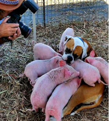 La perra se encargó de amamantar a los cerditos que se encontraba en  situación de desnutrición.