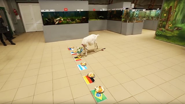 Le pusieron seis banderas delante, las de Brasil, Alemania, Argentina, Bélgica, Francia y Rusia. En cada una de ellas había un plato de comida identifico y la cabra debía elegir uno.