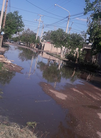 Una calle en mal estado y cubierta de agua es lo que se ve en la imagen enviada por un lector de Villa Krause, en Rawson.