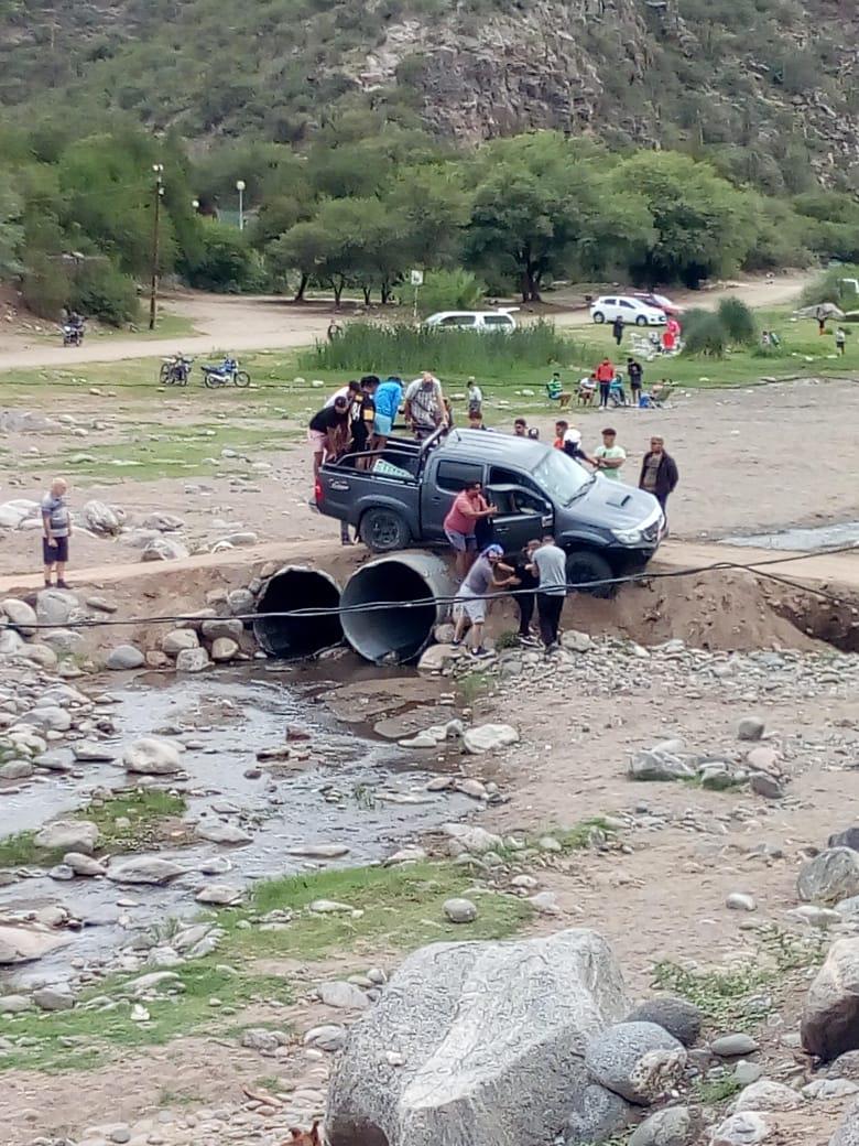 Este domingo en la tarde, turistas y vecinos de Valle Fértil debieron ayudar a una familia que quedó al borde de volcar con su camioneta en un puente improvisado que atraviesa el río.