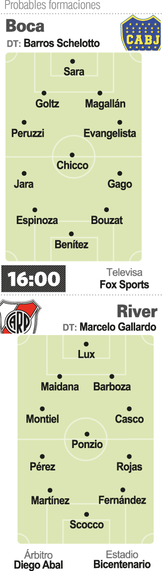 En cuanto a River, Ignacio Scocco será el único punta fijo y la última línea se conformará con dos juveniles, Gonzalo Montiel ocupará la posición de lateral derecho y el segundo central será Alexander Barboza. Los jugadores que le faltan son el paraguayo Jorge Moreira, el argentino Javier Pinola y el uruguayo Camilo Mayada, cada uno con sus respectivas selecciones. En caso de empate al cabo de los noventa minutos, la posesión de la Copa BBVA Francés, provista por el sponsor principal de uno y otro equipo, se definirá por penales.