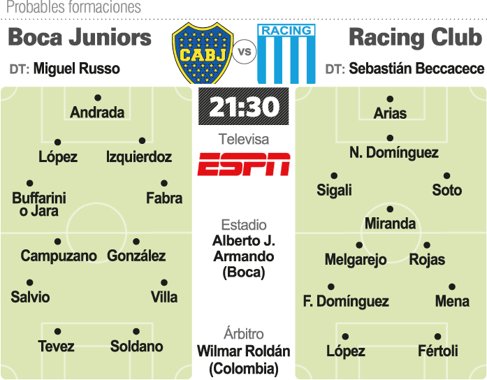 Racing, por su parte, irá a la Bombonera con la tranquilidad de saber que con un empate clasificará a la siguiente ronda. Sin embargo, el entrenador del conjunto albiceleste, Sebastián Beccacece, no realizará modificaciones defensivas para intentar cuidar el resultado conseguido como local y repetirá el mismo once de la semana pasada.