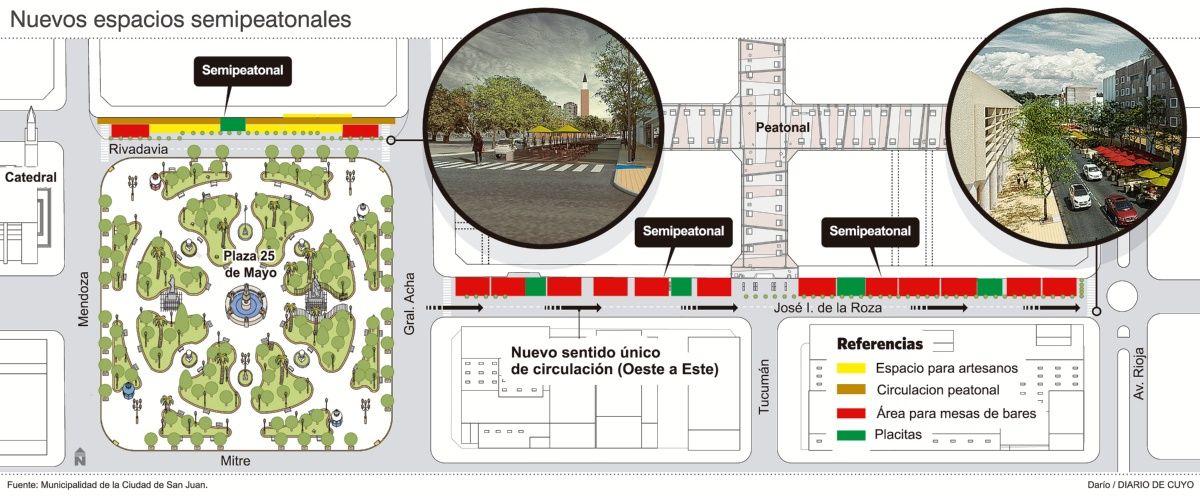 El tramo de avenida Ignacio de la Roza que va desde calle General Acha hasta avenida Rioja cambiará su fisonomía por completo. Es que se convertirá en una zona semipeatonal donde instalarán los cafés y confiterías que hoy están en la Peatonal que está siendo remodelada. Así, la avenida tendrá un solo sentido de circulación de vehículos que será de Oeste a Este. "Además de dar vida a los cafés de la zona, buscamos que la gente tenga un nuevo espacio céntrico donde permanecer, por eso habrá hasta espectáculos artísticos", dijo Franco Aranda, intendente de la Capital.