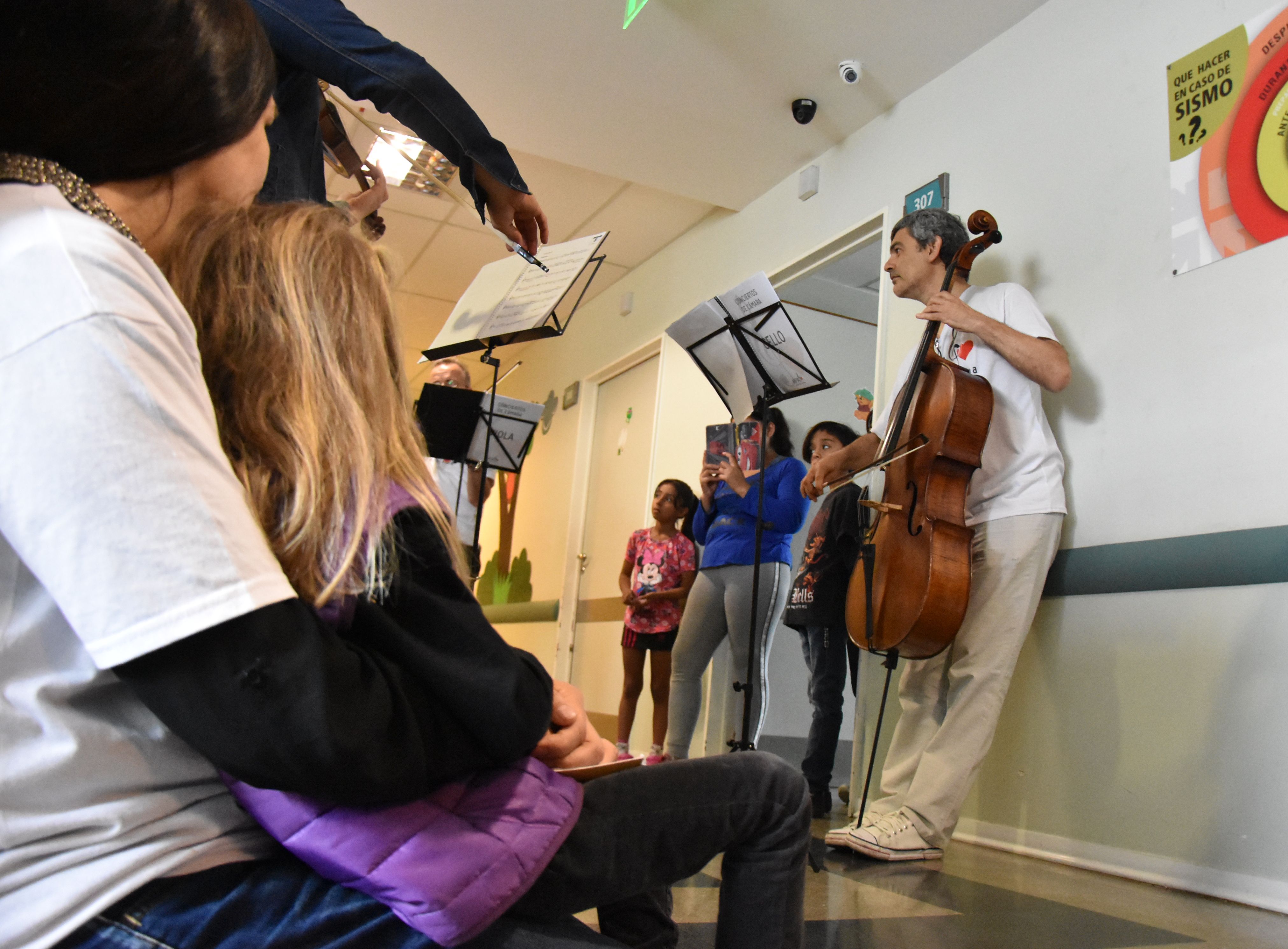 A las 9 en punto -tras un ensayo de media hora en el que aprovecharon para conocerse luego de su contacto virtual-, las notas comenzaron a fluir en el hall del Hospital para sorpresa de quienes allí se encontraban para ser atendidos o esperando su turno de visita. De pronto, el espacio se convirtió en una sala de conciertos y todos ellos se transformaron en espectadores de lujo. Por un momento, la tristeza y el agobio abandonaron los rostros para darle lugar al placer, que junto con la alegría coparon los corazones de los adultos, y las caritas de los niños allí internados volvieron a sonreír pícaras cuando los artistas recorrieron el área de pediatría tocando canciones infantiles y permitiéndoles tomar el arco de sus cuerdas, como sucedió cuando el sanjuanino Julio Domínguez, que toca en la Filarmónica de Buenos Aires, acercó su violín a un nene que se encontraba en una de las camas y el porteño Jorge Bergero arrimó su violoncello a una niña que salió al pasillo del nosocomio.