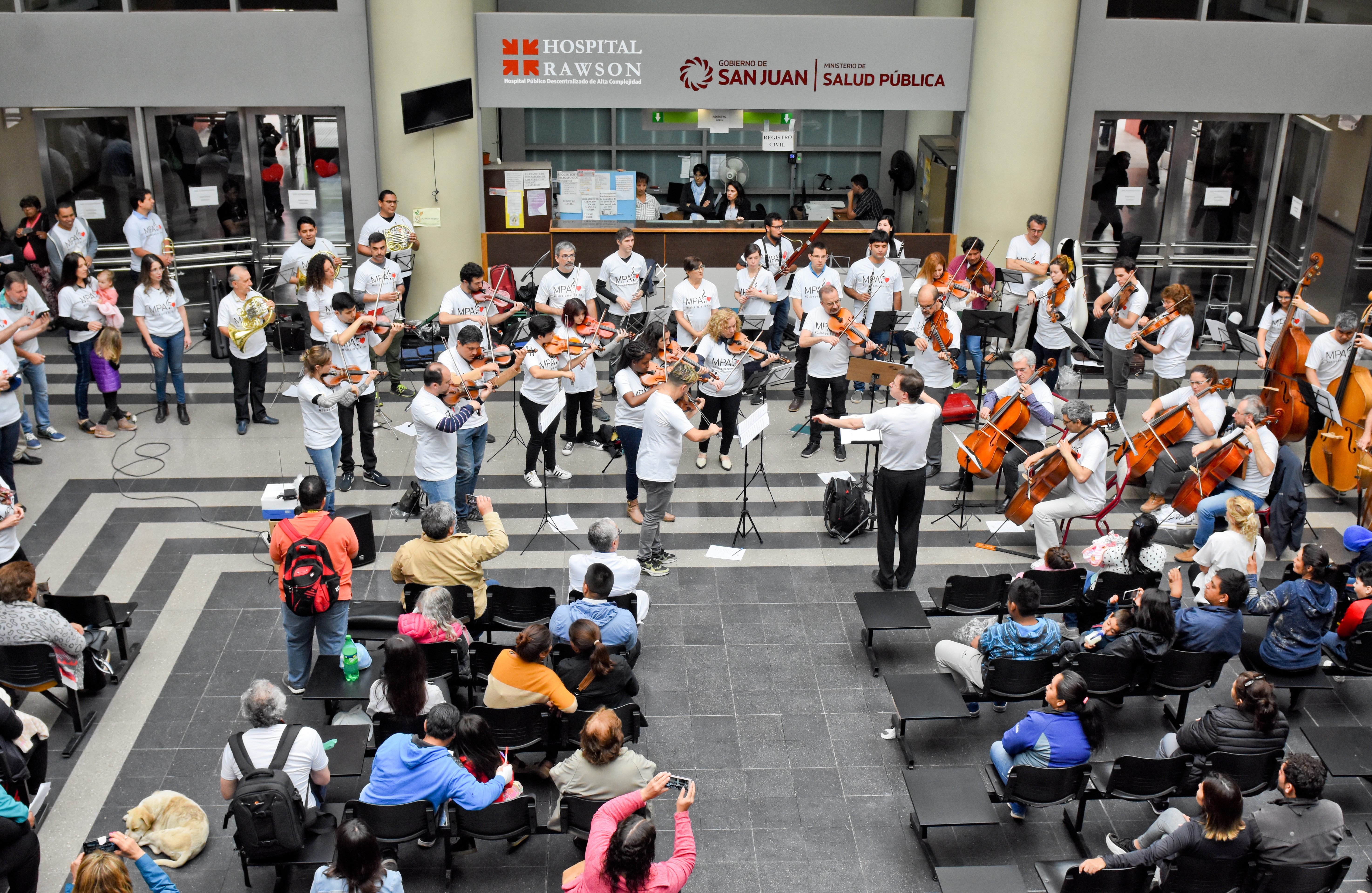 Después de compartir una tarde con los abuelos en el Hogar de Adultos Mayores Eva Perón el domingo pasado, el grupo solidario Música para el alma tuvo una conmovedora presentación en el Hospital Rawson ayer, al celebrar su actuación Nro. 400 junto a unos 50 integrantes de la Orquesta Sinfónica y más de 20 voces del Coro Universitario -ambos de la UNSJ- en una actuación que, además, recordó al recientemente fallecido Manuel Arellano que fue parte de la Sinfónica local y estaba inscripto para este acontecimiento. El eximio director Emmanuel Siffert también se sumó a la movida del conjunto porteño que, desde hace 6 años, se ocupa de "llevar paz" y "ánimo" a enfermos terminales y psiquiátricos, niños y adultos mayores que atraviesan sucesos difíciles.