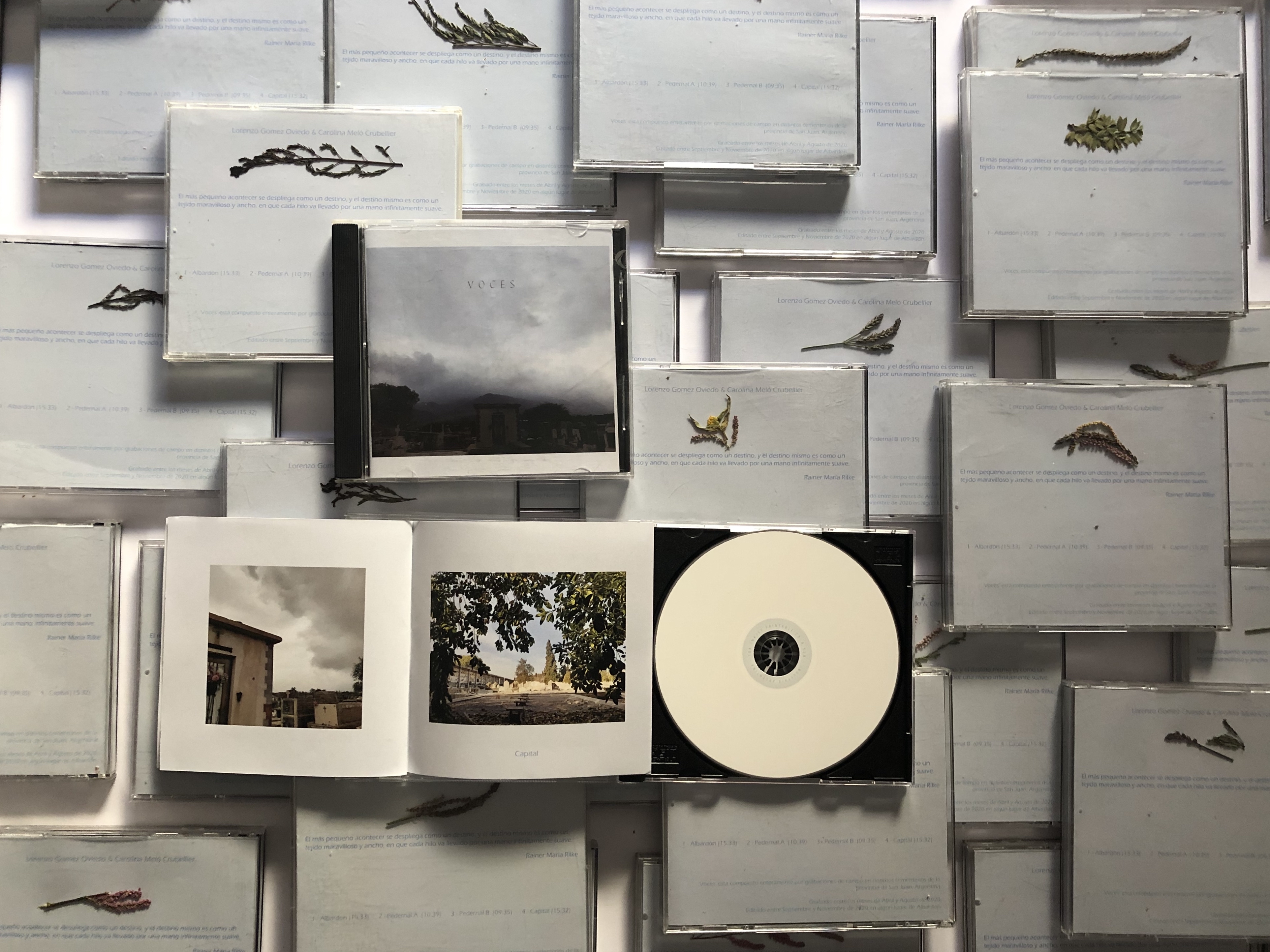 Lanzado por el sello Adaptador Récords, Voces es el primer disco póstumo que lleva los sonidos registrados por Carolina Meló Crubellier. La joven tenía 27 años de edad, estaba por recibir el título de Licenciada en Artes Visuales en la Facultad de Filosofía, Humanidades y Artes (FFHA) de la Universidad Nacional de San Juan y sufrió una descarga eléctrica, a consecuencia de la cual falleció días después. Al cumplirse el primer mes de su partida, se hizo la publicación del material que incluye una labor fotográfica que ella dejó como testimonio de la visión artística que compartía con su pareja y colega, Lorenzo Gómez Oviedo, que combina la tarea de músico con la de director de Adaptador Récord.