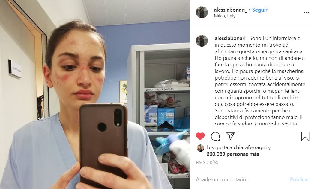 Alessia Bonari es una joven enfermera que está ayudando a combatir el coronavirus en Milán, Italia. En un posteo que se viralizó en Instagram, publicó una selfie suya frente al espejo donde mostró las marcas que le dejó el barbijo en la cara luego de usarlo durante tantos días para protegerse mientras ayuda a sus pacientes.