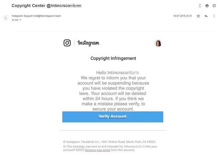 "Tu cuenta quedará permanentemente eliminada por violación de derechos de autor", informa el mensaje, enviado por una dirección que parece oficial, de cuentas como mail@theinstagram.team o info@theinstagram.team.