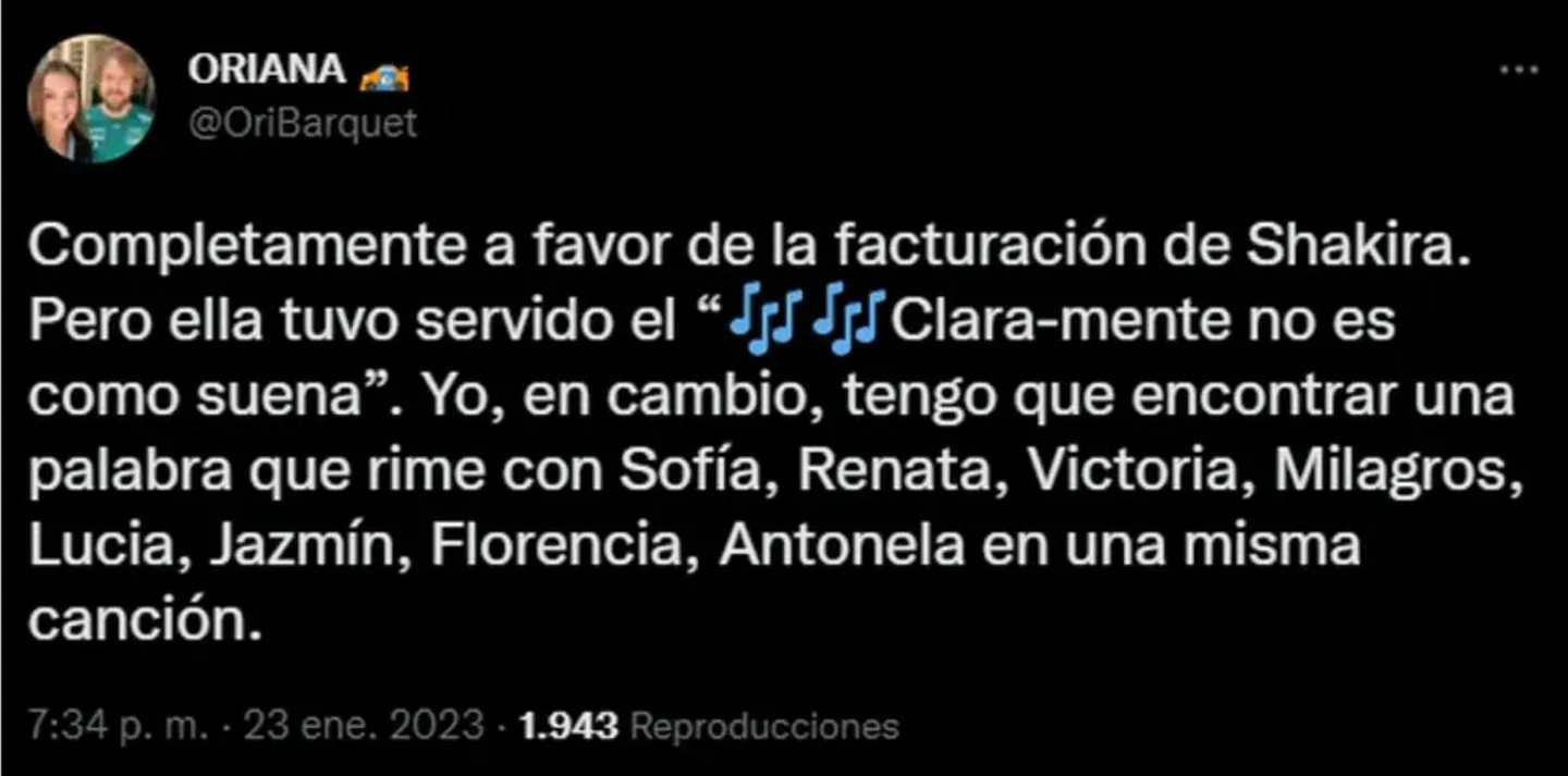 Barquet reveló que estaba “completamente a favor de la factura de Shakira, pero ella tuvo servido el ‘Clara-mente no es como suena’”, empezó el polémico tuit.
